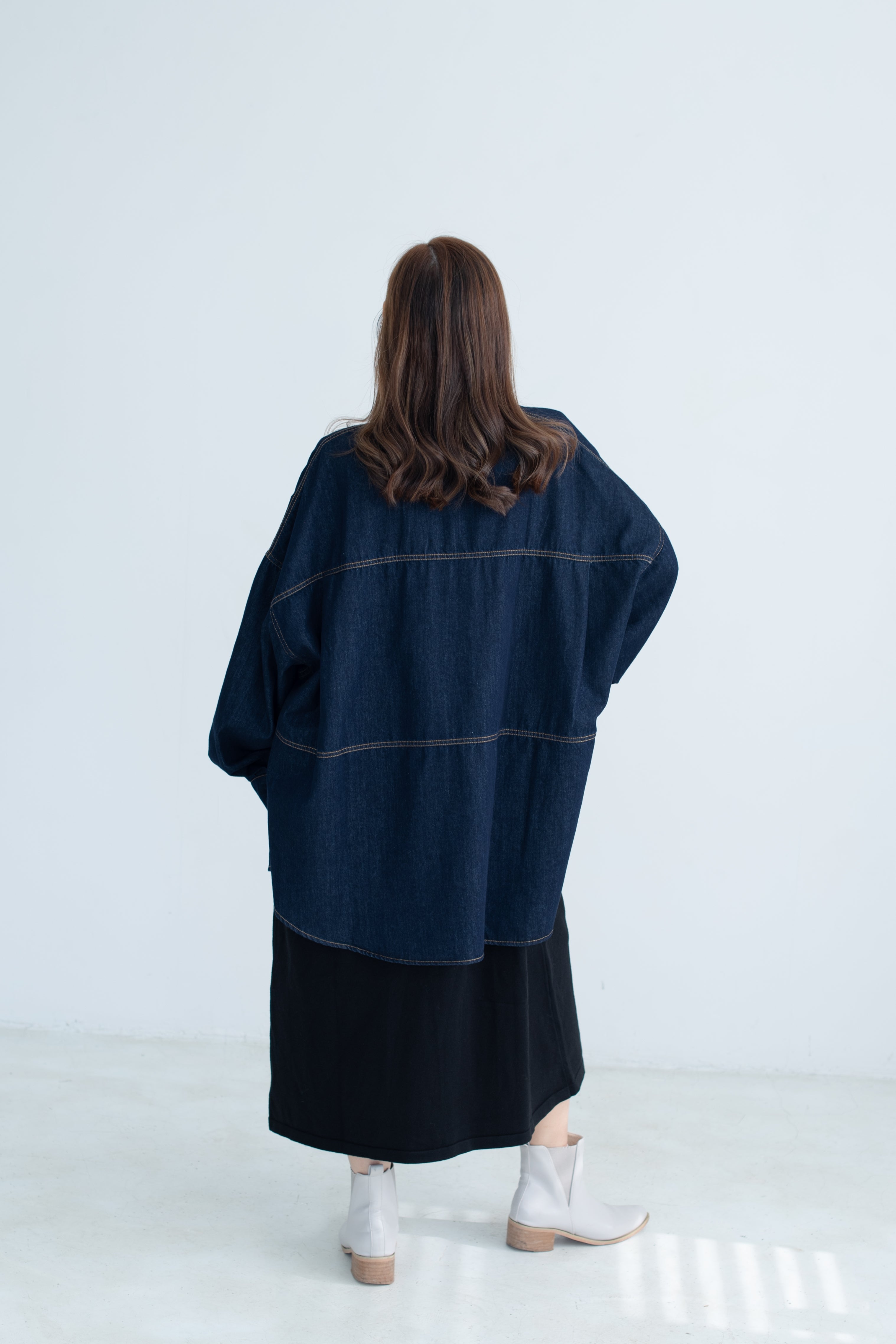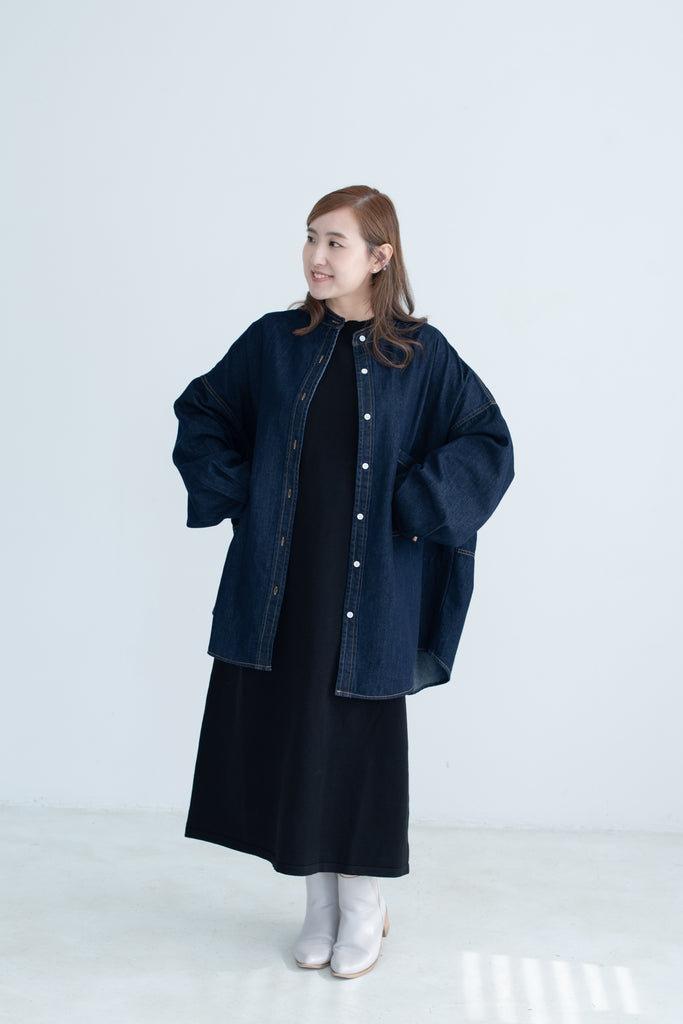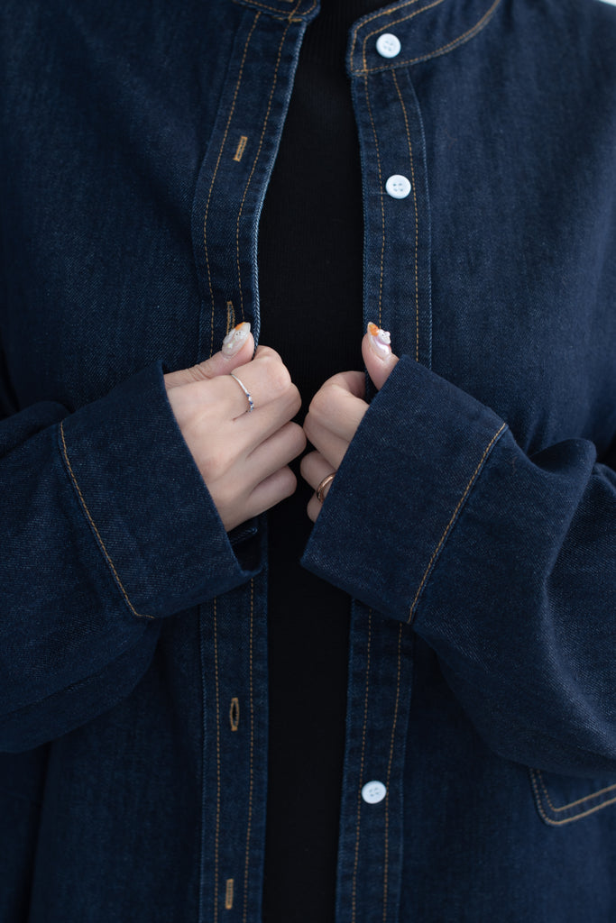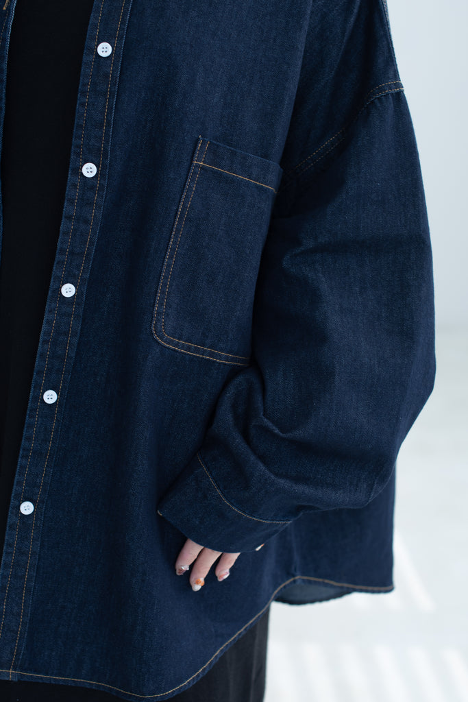 This oversized denim shirt jacket blends a relaxed fit with soft puff sleeves, adding a subtle feminine touch to a classic silhouette. Effortlessly versatile for layering, it’s the perfect piece for a laid-back yet refined everyday look.
