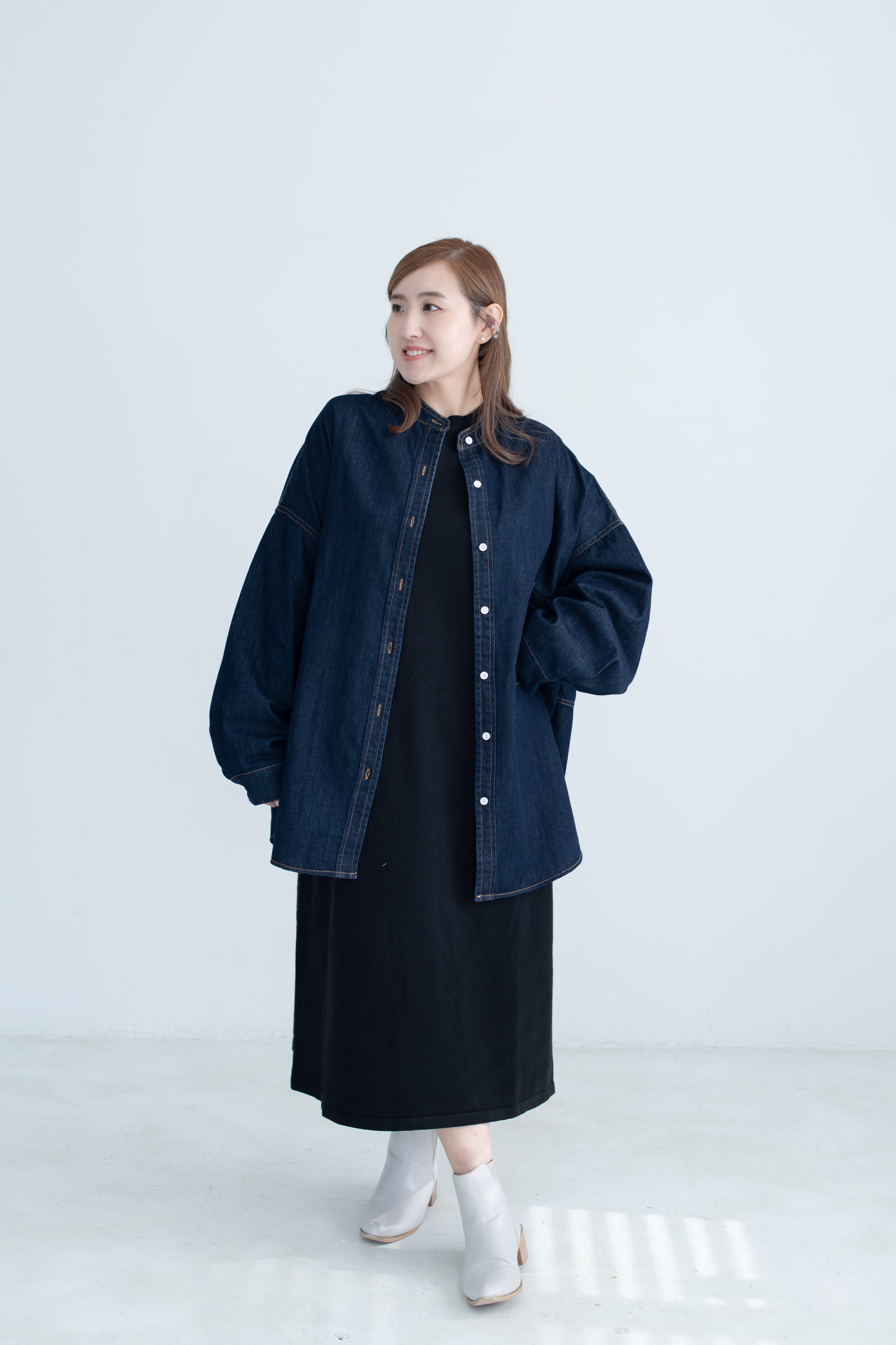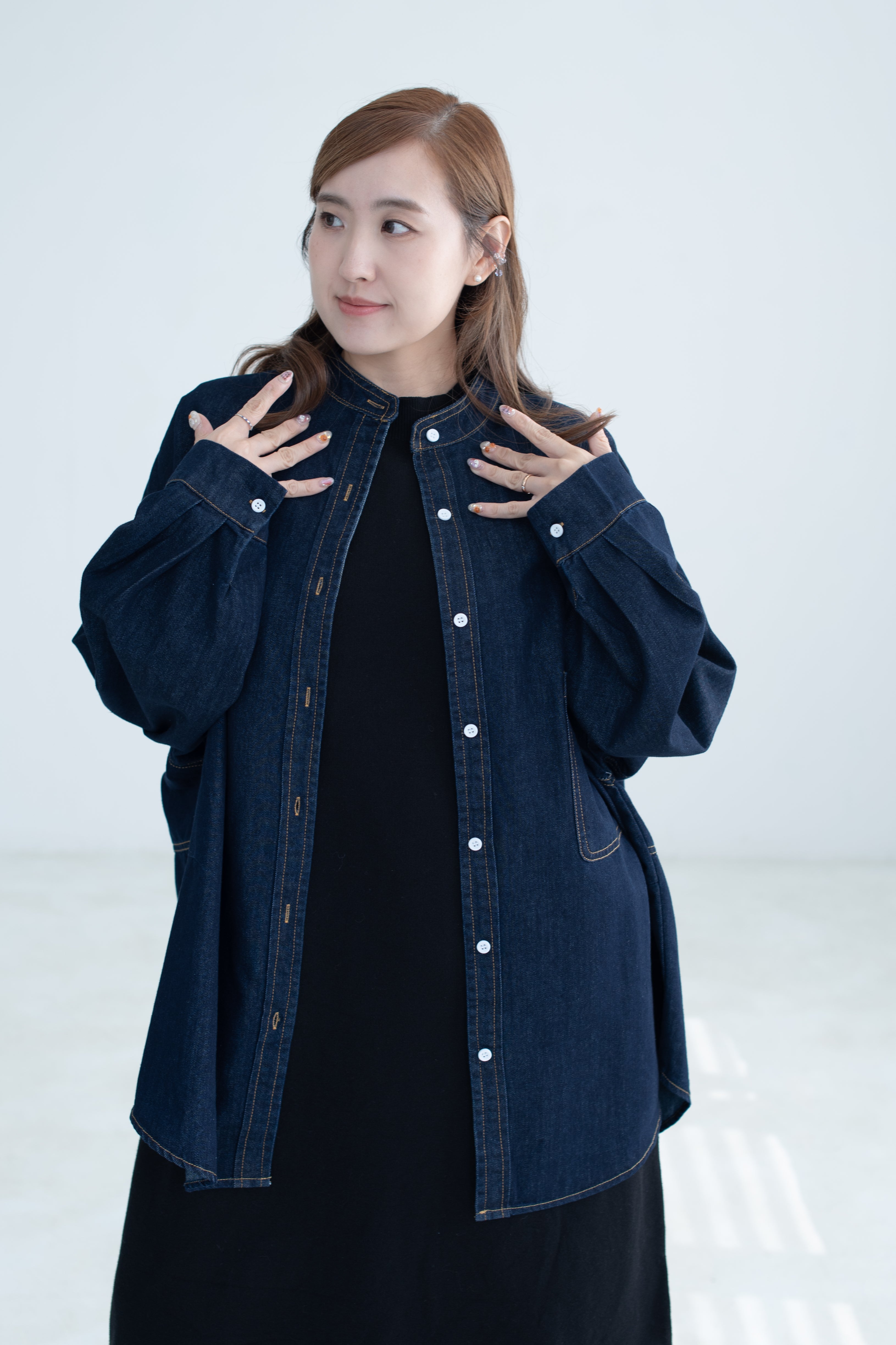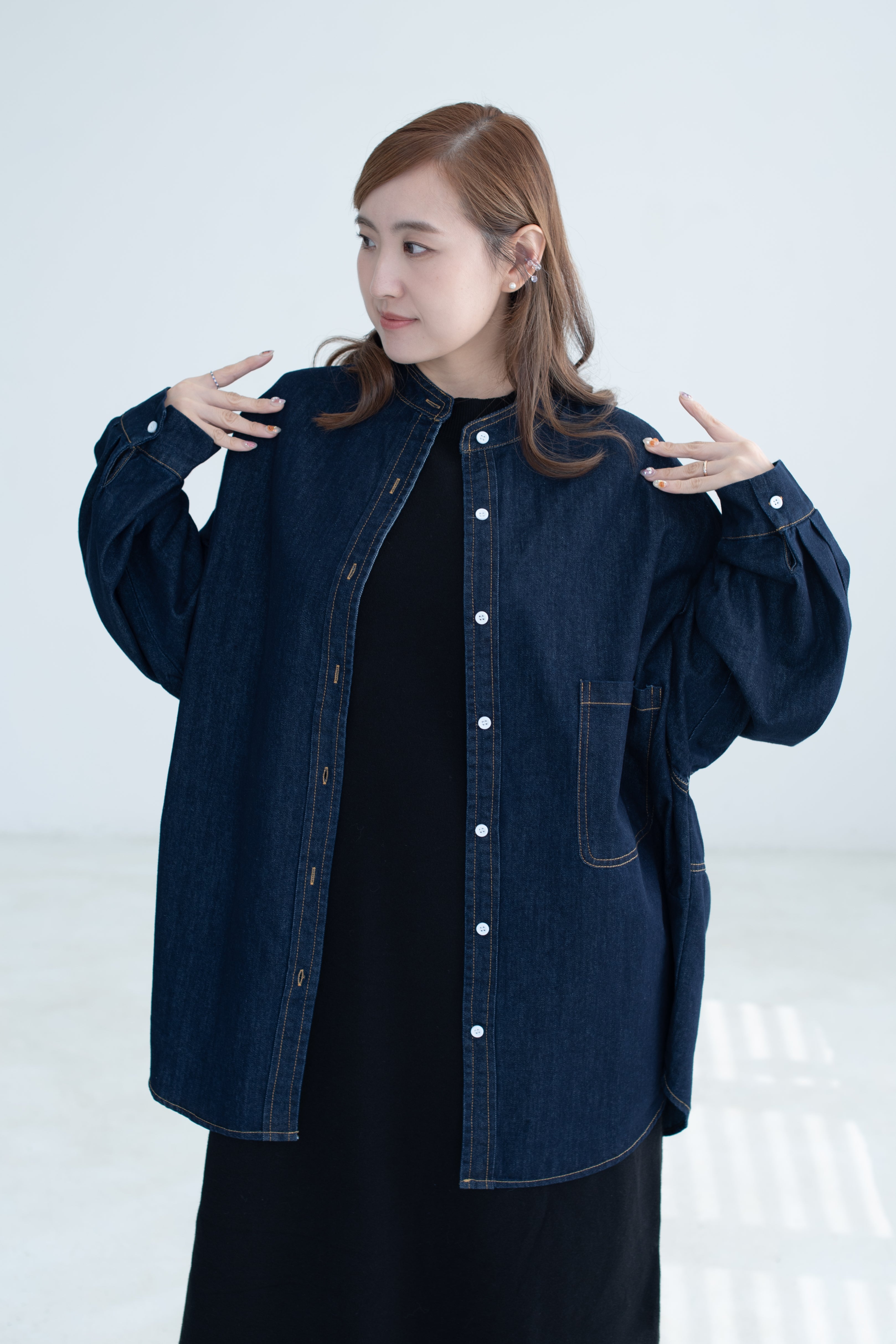 This oversized denim shirt jacket blends a relaxed fit with soft puff sleeves, adding a subtle feminine touch to a classic silhouette. Effortlessly versatile for layering, it’s the perfect piece for a laid-back yet refined everyday look.