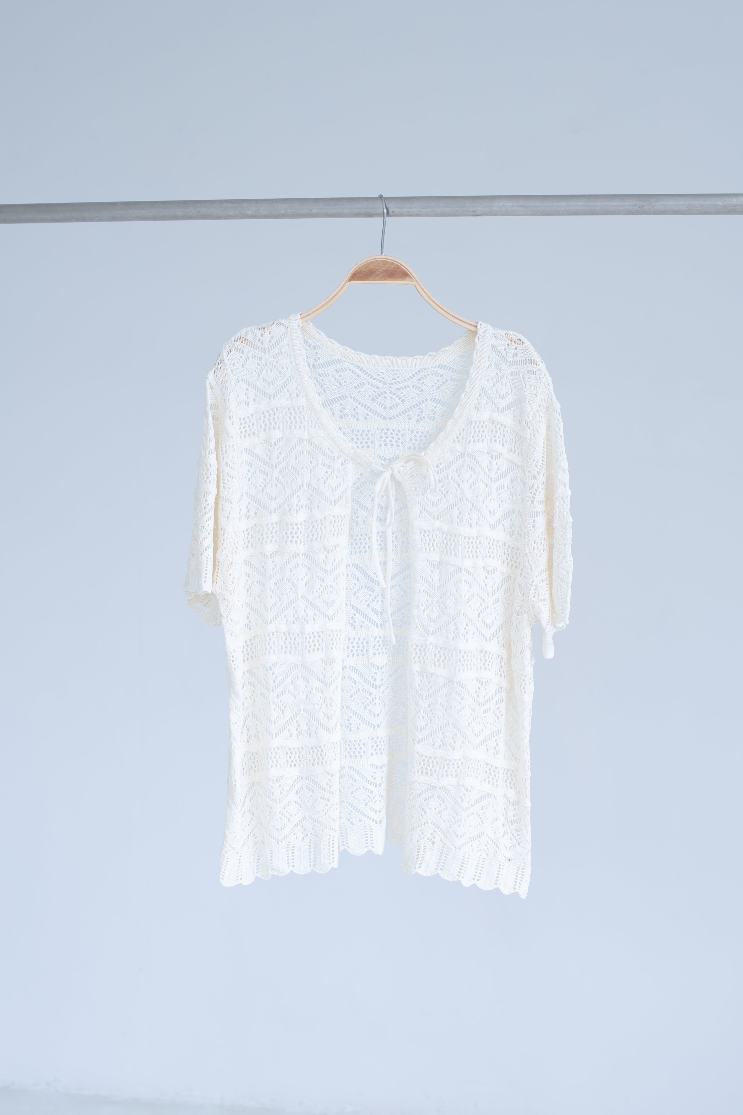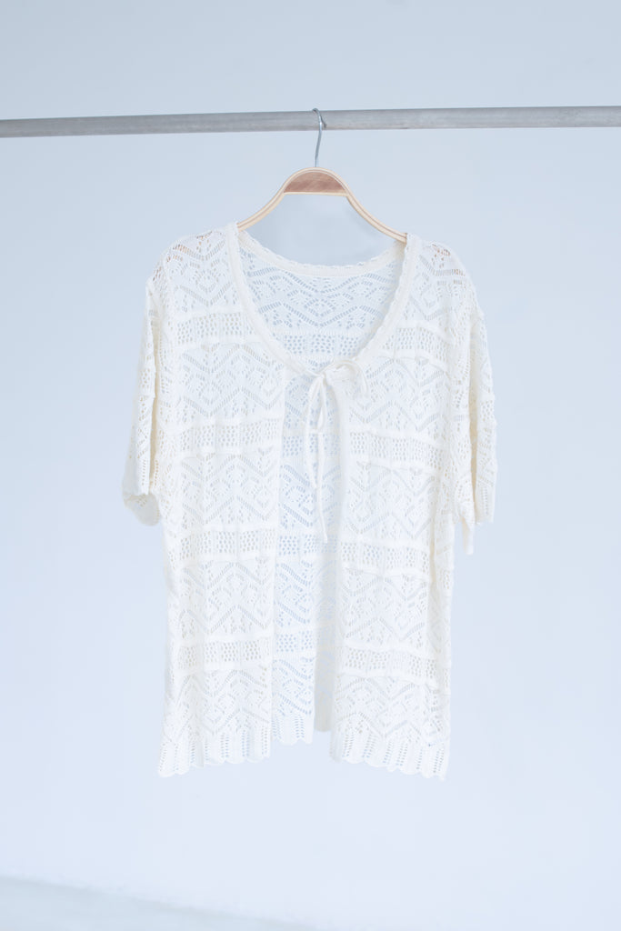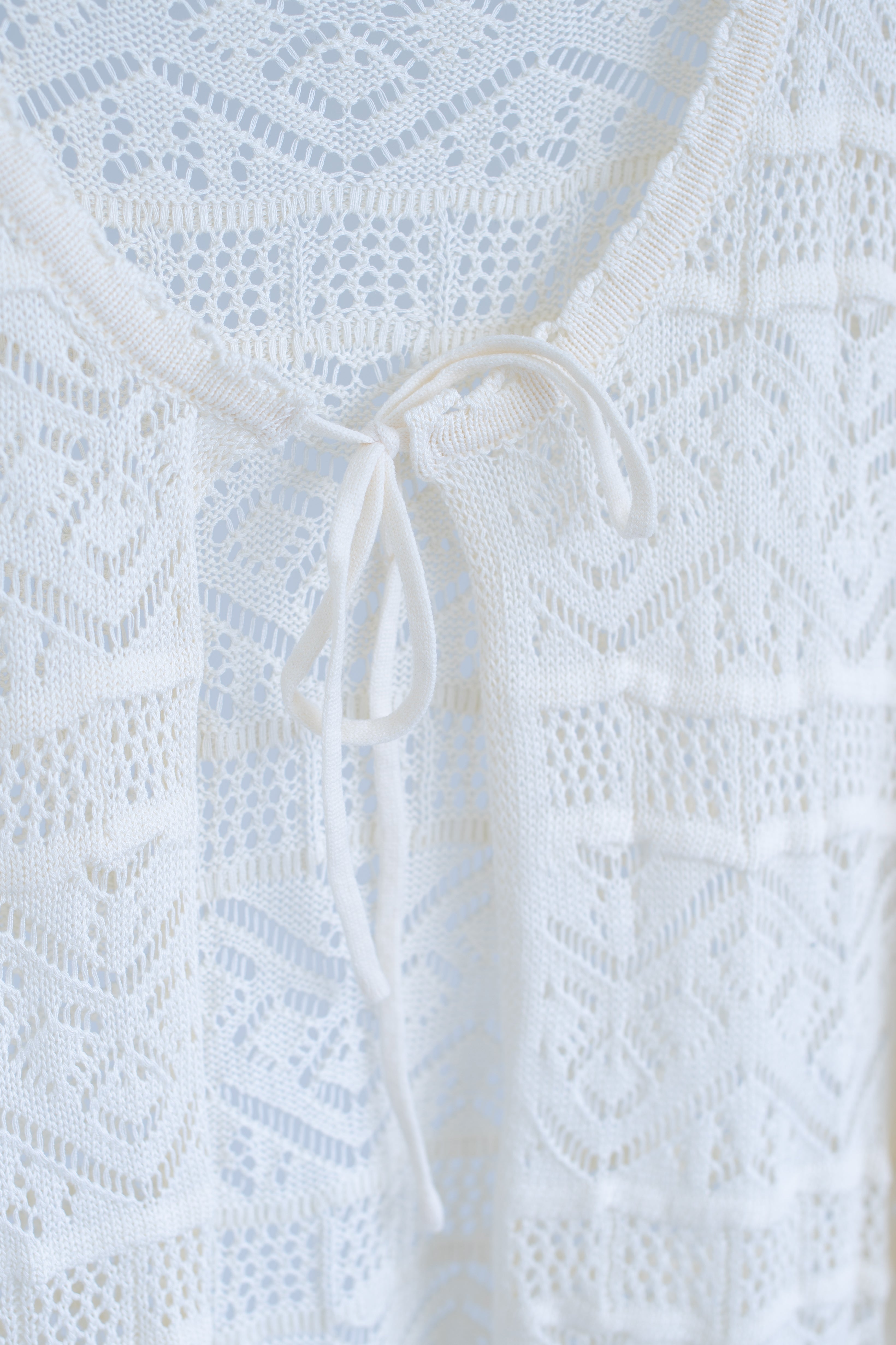 針織外套以鏤空花紋配合前綁帶細節,散發清新氣質。