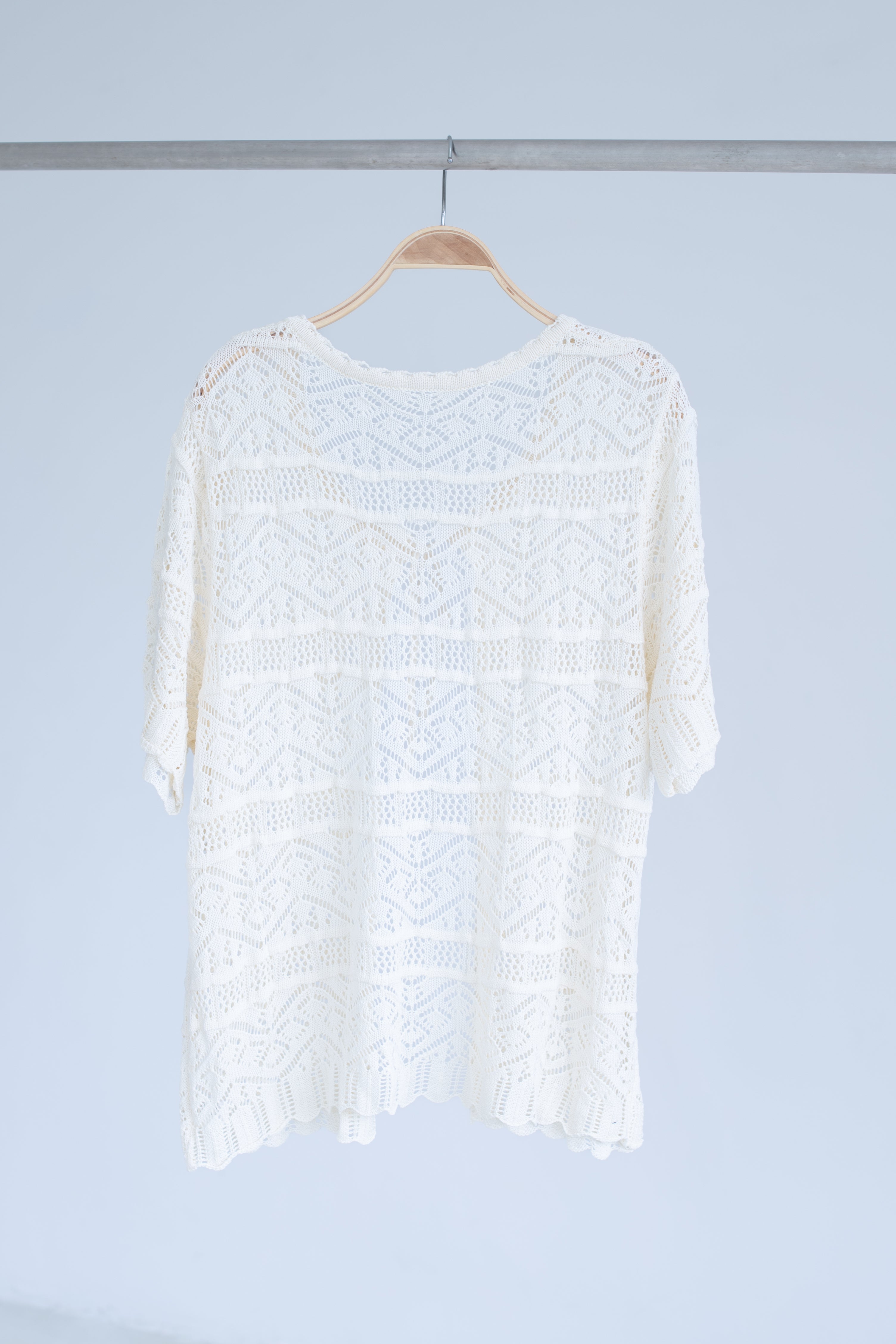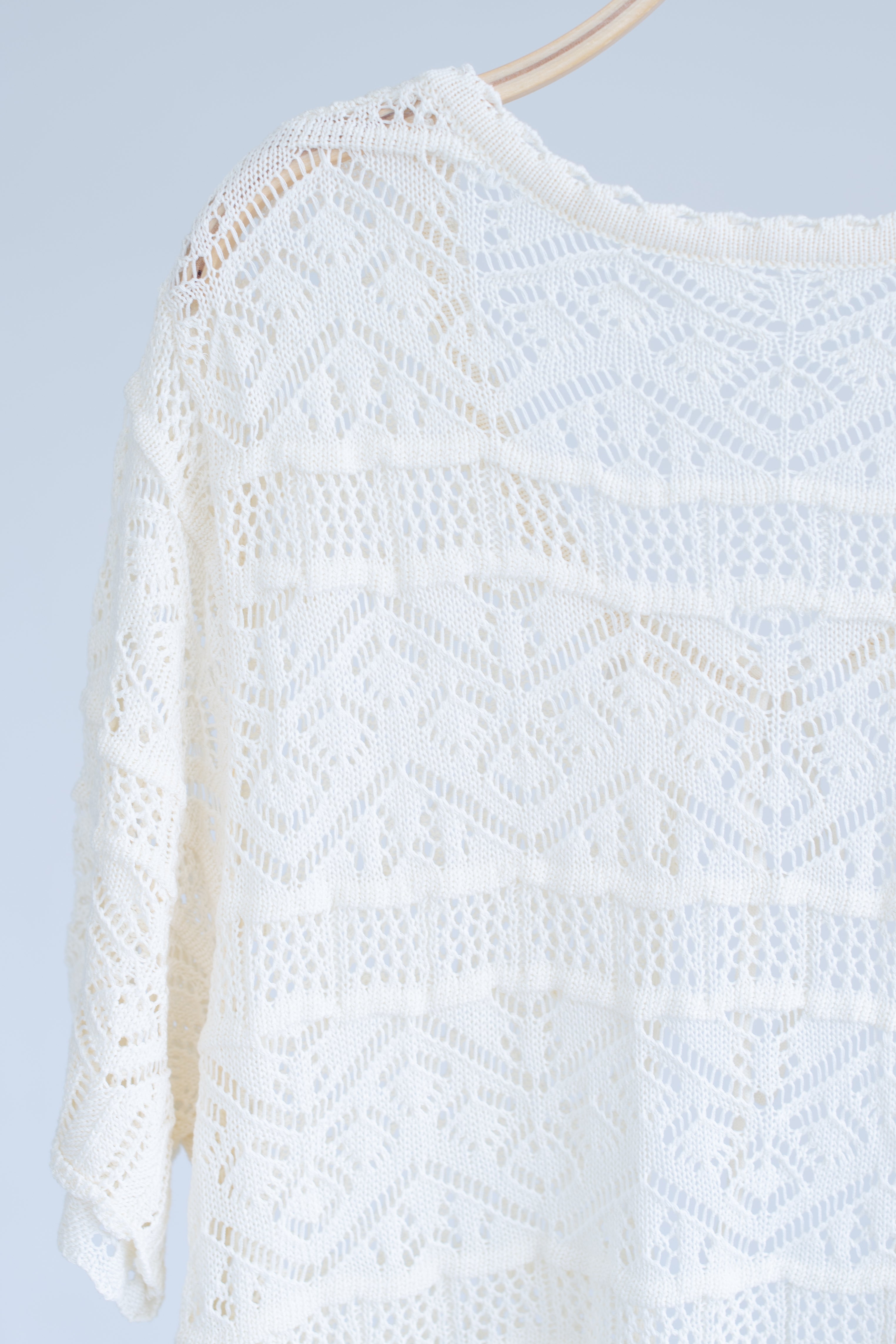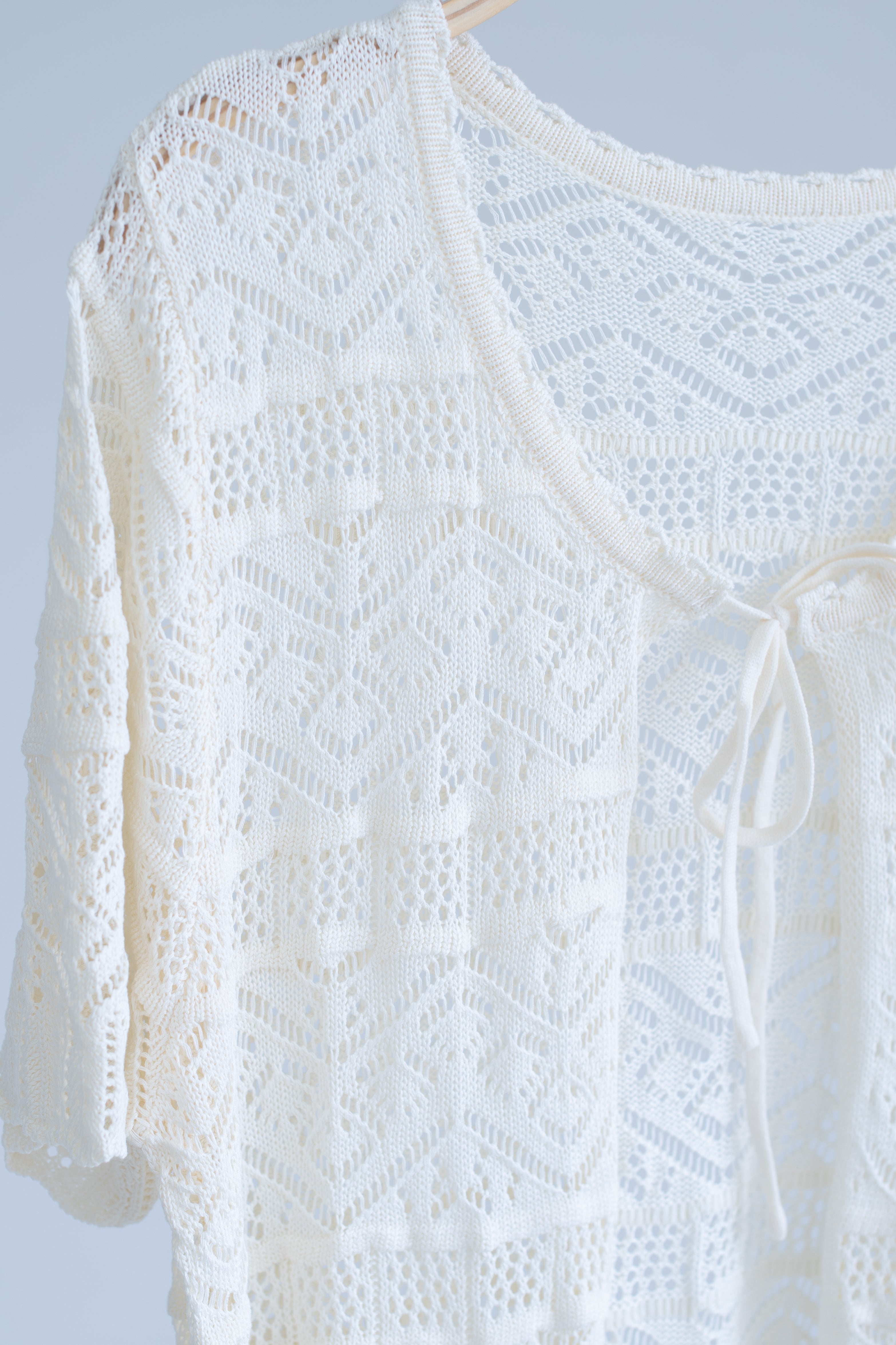 針織外套以鏤空花紋配合前綁帶細節,散發清新氣質。